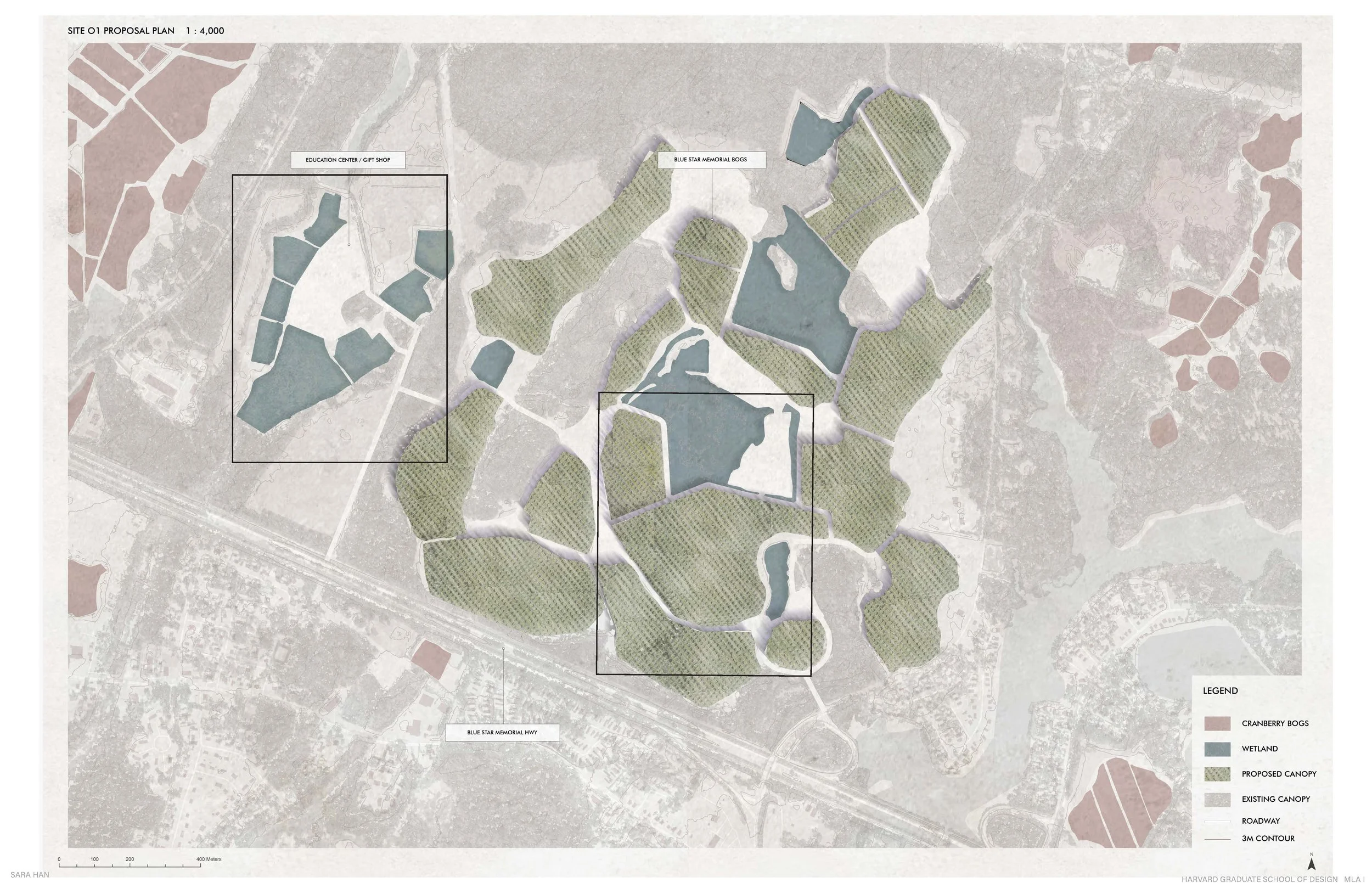 However, today, cranberry growth and its practice are threatened by warming temperatures that might one day eradicate the once-booming industry and core culture of this land. BENEATH THE UMBRELLA BLOOM proposes the incorporation of forestry to provide shade within the bogs, creating cooling microclimates that can help to extend the life of the cranberry culture.