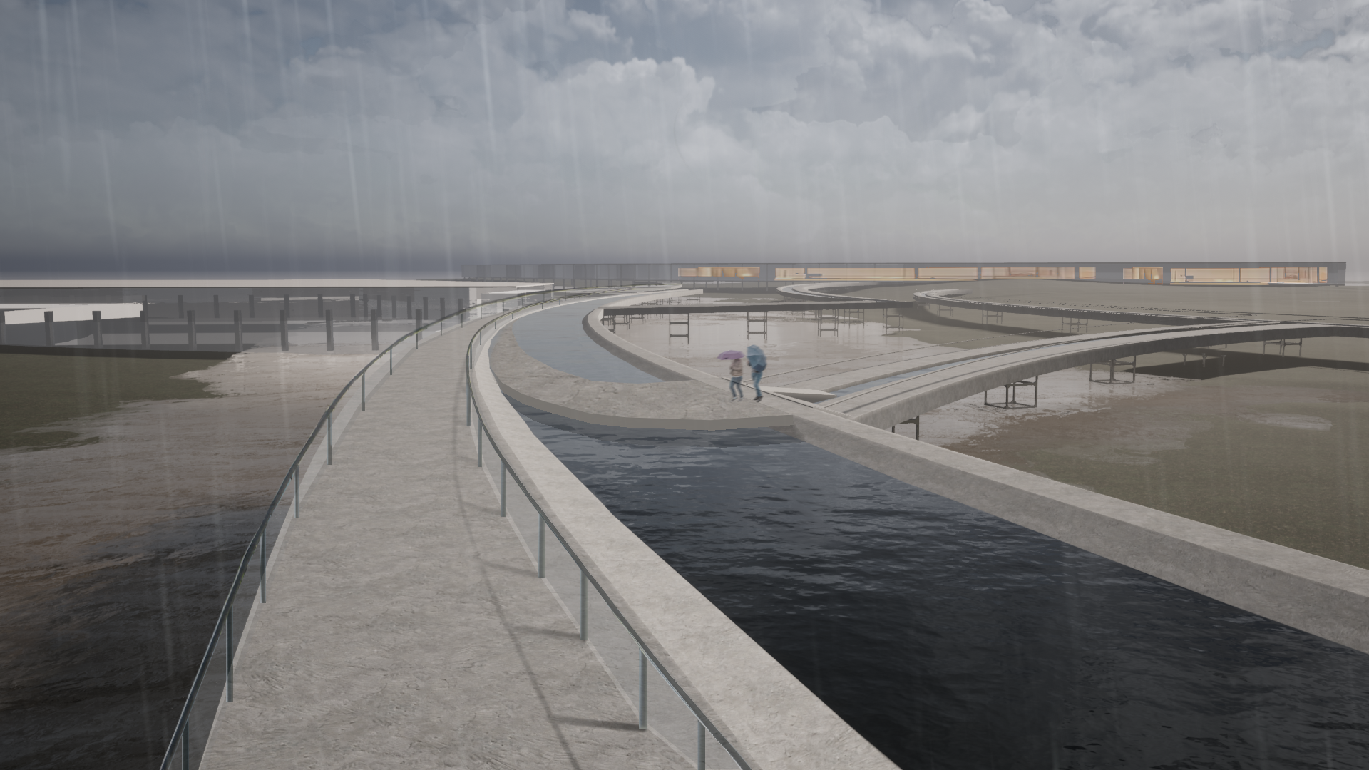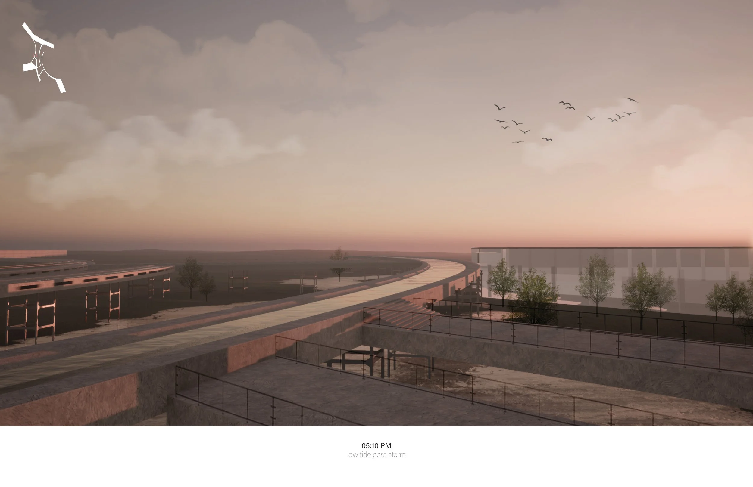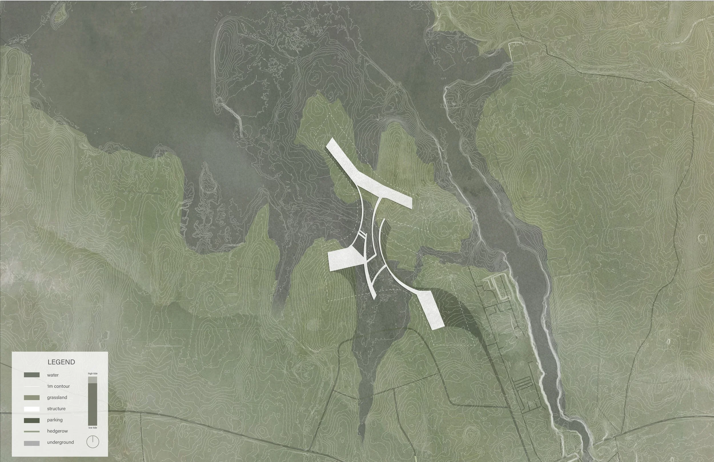The River Shannon’s pollution has pushed residents to not be able to source clean water in a country that one would regularly think would never have problems sourcing water. This project designs for the possibility of a major flood event and future sea-level rise adaptation, turning agricultural land into wetland edge as a shelter for data, privacy, and resource.