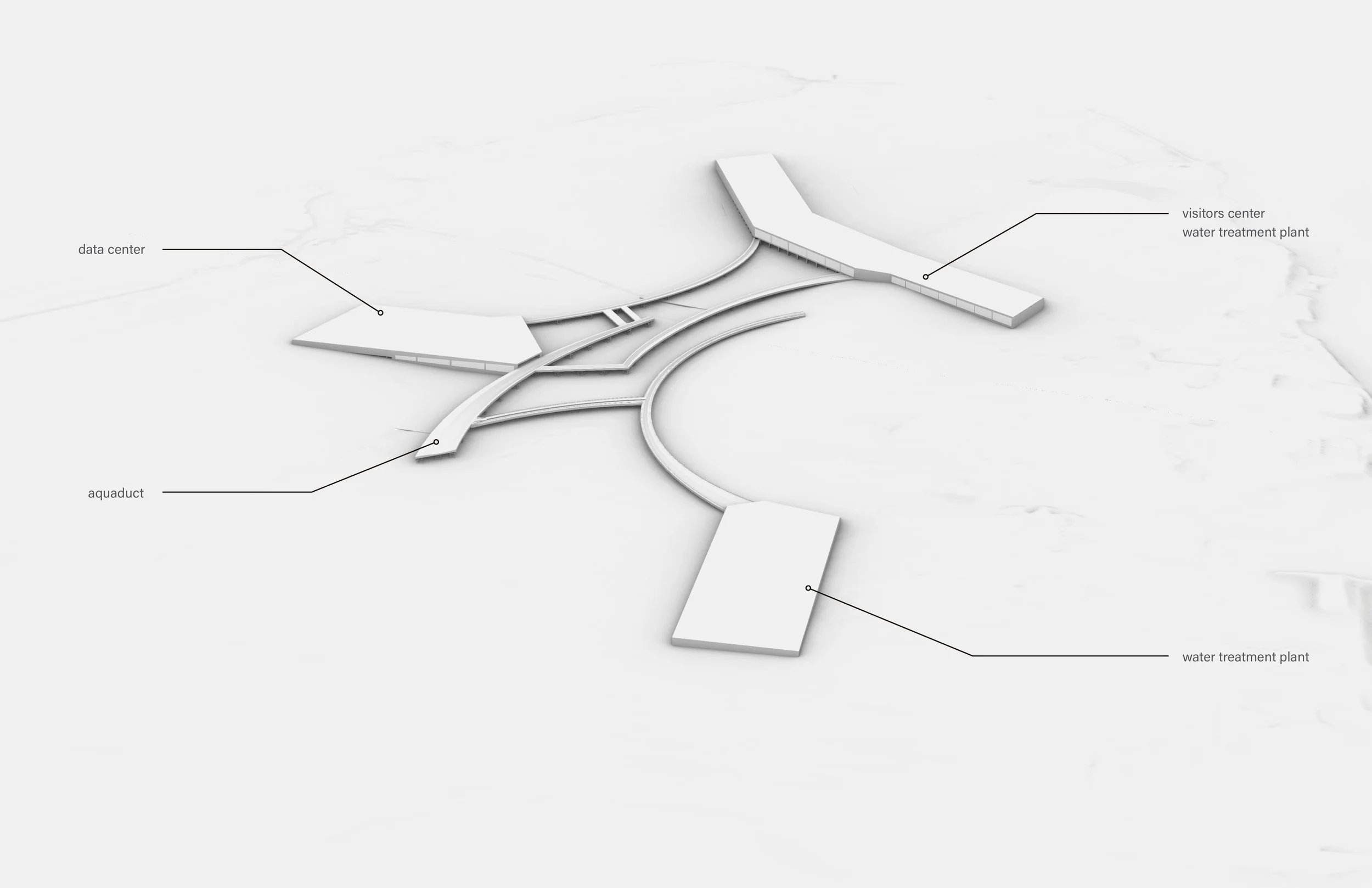 By sheltering the data center underground, the excavated material reshapes the existing contours of the land’s “visual quilt”. This guides the flow of water for future flooding events. The data center will act as a center to filter, direct, and store rain and ground water to supply nearby communities while simultaneously cooling the facilities